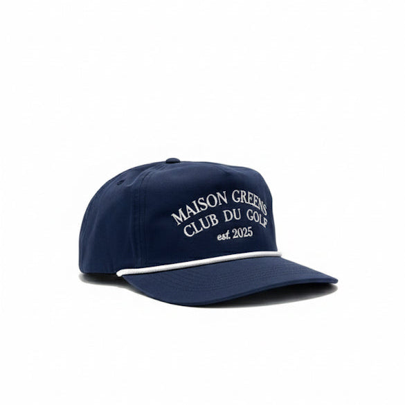 Crafted from a certified nylon and cotton blend, this structured cap combines timeless design with modern sustainability. Featuring a single-panel pinch front, contrast piping, and an embroidered Maison Greens “Club du Golf” crest, it captures the effortless sophistication of the course.
